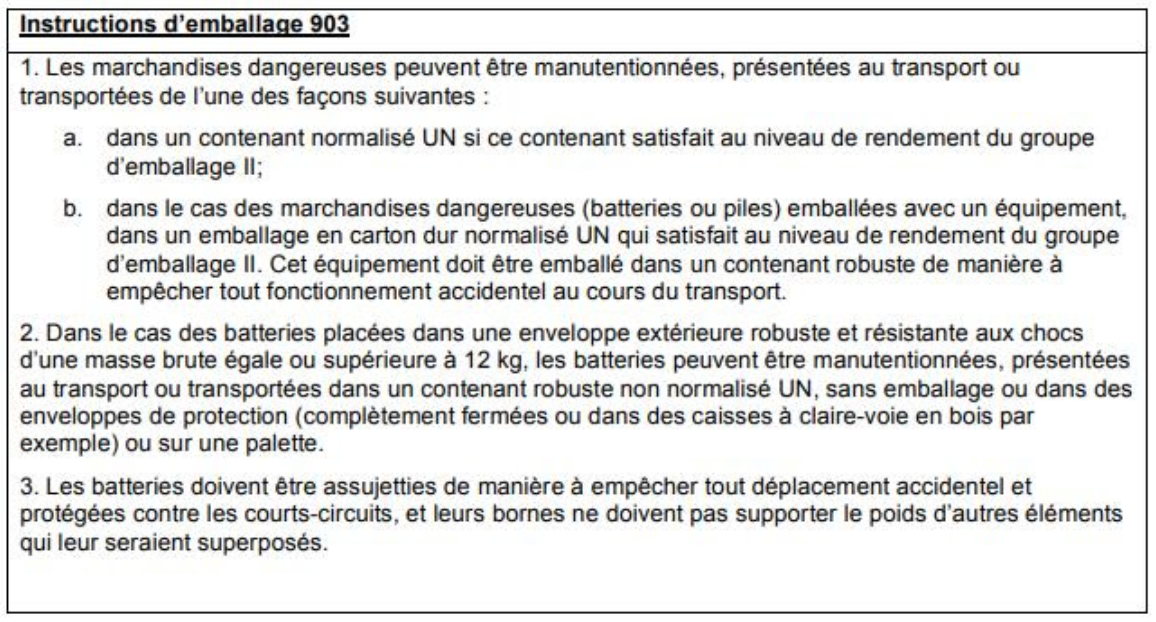 Une fois que vous connaissez votre numéro d’instruction d’emballage, vous allez à la partie B, qui répertorie toutes les instructions d’emballage, et vous trouvez 903. Une fois que vous aurez accédé au PI 903, il vous indiquera tous les emballages spécifiques qui peuvent être utilisés. Par exemple :
