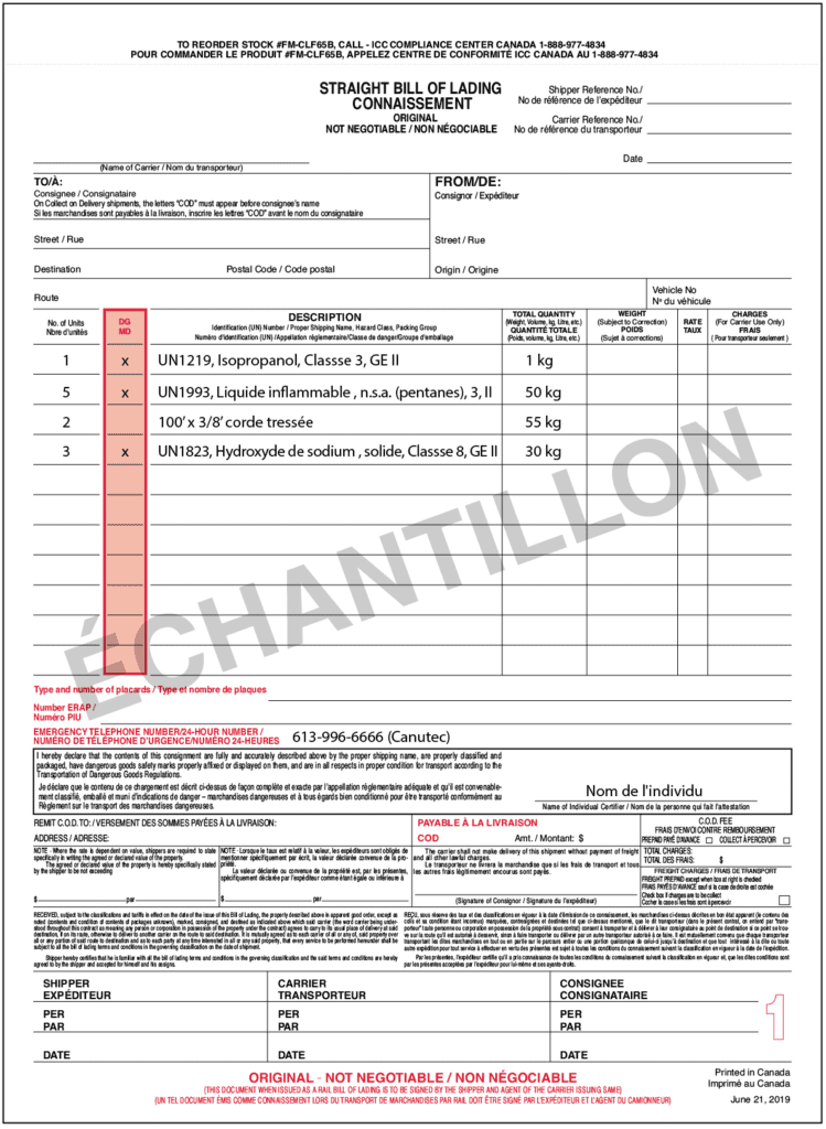 - Le document doit comporter le nom de l’individu qui a complété le document d’expédition (en lettres moulées mais la signature n’est pas requise)