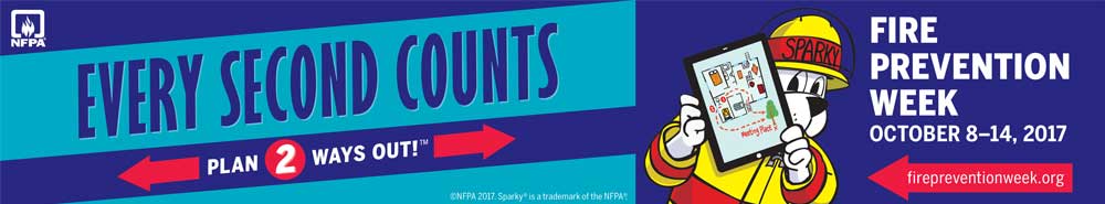 The National Fire Protection Association (NFPA) has designated the week of October 8th as Fire Prevention Week. This date was chosen as the Great Chicago fire started on October 8, 1871. Each year a theme for the week is chosen in an effort to keep fire safety present in people’s minds. This year’s theme is “Every Second Counts: Plan 2 Ways Out!” An explanation of the theme is best explained by a video from Sparky, The Fire Dog.